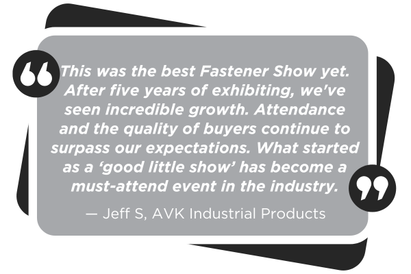 International Fastener Expo is the largest and most established gathering of the fastener industry in North America and 69% of exhibitors say it is the “must-exhibit at” event. Why? Because they know it is the #1 show in North America where customers and prospects come to see you, the supplier. At the International Fastener Expo, suppliers like yourself will find qualified eager attendees looking for new sources and solutions to a myriad of manufacturing and fastening applications. All in one place. No other fastener expo can deliver the type of qualified audience that the International Fastener Expo does every year.